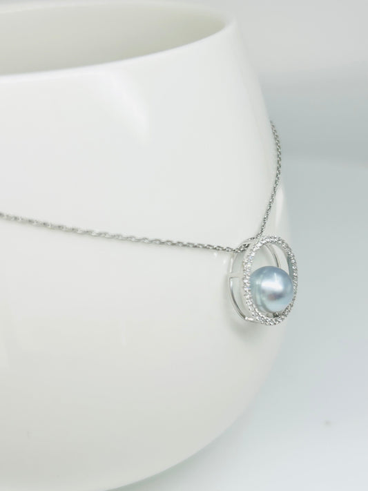 18K Solid Gold Saltwater Japan Akoya Silver Blue Pearl Pendant (7.5mm) with Cubic Zirconia