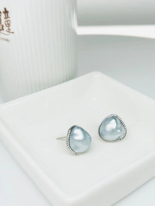 18K Gold Silver-Blue Southsea Baroque Earrings (13 x 18mm) with Cubic Zirconia