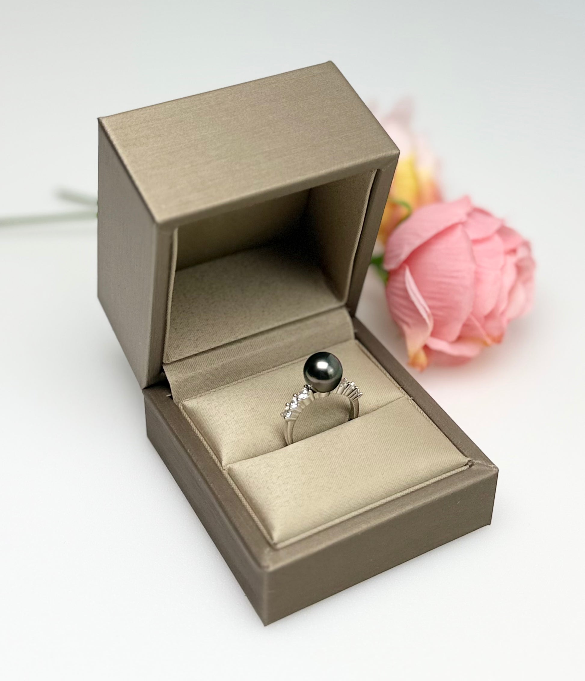 Indulge in timeless elegance with our exquisite Tahitian ring. This stunning pearl, renowned for its deep, iridescent luster, reflects shades of green and black making each piece truly unique. Set in a beautifully crafted band, this ring exudes sophistication and charm, perfect for any occasion. Whether worn as a statement piece or paired with other fine jewelry, its natural beauty and luxurious appeal will elevate your style effortlessly. Embrace the allure of Tahitian pearls and let this breathtaking ring add a touch of refinement to your jewelry collection.